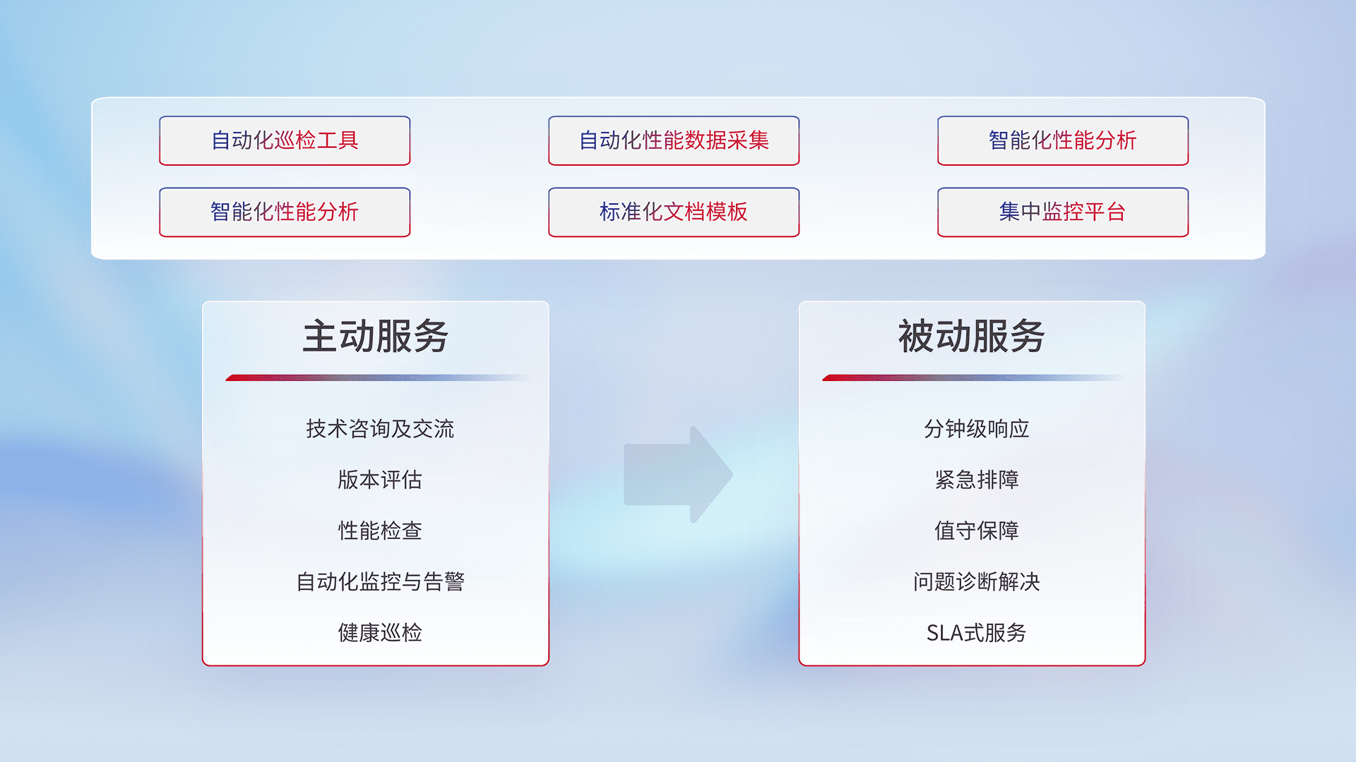 智能化工具和标准化文档,,,保障服务质量,,提供主动服务(包含技术咨询、、版本评估、、、、性能检查、、自动化监控与告警、、健康巡检)和被动服务包含(分钟级响应、、紧急排障、、值守保障、、、问题诊断解决、、、SLA服务)。。。。